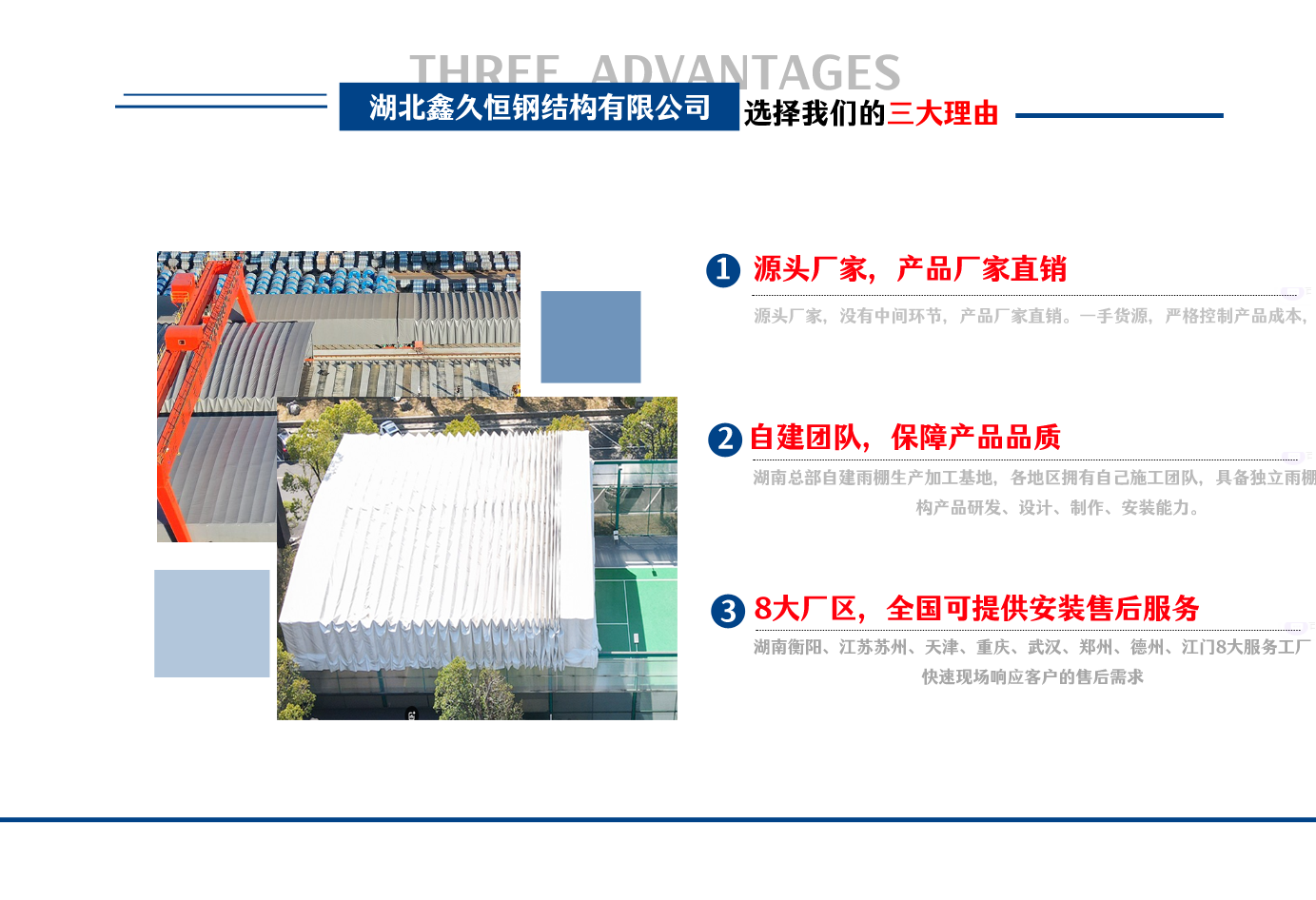 湖北鑫久恒鋼結構有限公司是一家電動雨棚、膜結構車棚研發(fā),生產銷售,施工安裝于一體的專業(yè)鋼結構科技公司,主要產品有伸縮雨棚,電動雨棚,膜結構車棚等。 湖南地區(qū)職員目前有80多人,占地面積20000平方米,廠房面積15600平方米,配備先進的生產流水線,使每件品質產品的堅實基礎。 公司在蘇州、天津、重慶、武漢、德州、烏魯木齊、江門均設有服務工廠,總人員共300多人,擁有專業(yè)的技術團隊,配備先進的設備和流水線生產,產能高,貨源充足,發(fā)貨速度快,服務區(qū)域廣。 移動伸縮棚適用于通道臨時倉儲、戶外運動遮陽、污水池遮蓋、能源交通、熱力化工、礦山、船舶制造及市政建設、物流、碼頭等領域的構件制作加工,成品半成品存放、倉庫、野外儀器設備操作用房等。尤其是對工廠發(fā)貨、倉儲臨時遮雨防嗮,梅雨期較長、建設周期較短的工程施工等特別適用。還可根據用戶需求量身定制、適合企業(yè)所需不同款式的產品。 我公司堅持“誠信社會為本,客戶滿意為榮”的經營理念,做到質量把控,嚴格管理,精益求精,恪守承諾。使鑫久恒逐步走向成熟,其系統化、專業(yè)化日趨完善。以專業(yè)的技術、科學的管理,更高的產品質量,優(yōu)良的企業(yè)信譽,真誠的客戶服務,靈活多樣的經營方式和務實創(chuàng)新的企業(yè)精神愿與社會各界攜手合作,為推動智能鋼結構建筑事業(yè)的發(fā)展而不斷努力。...